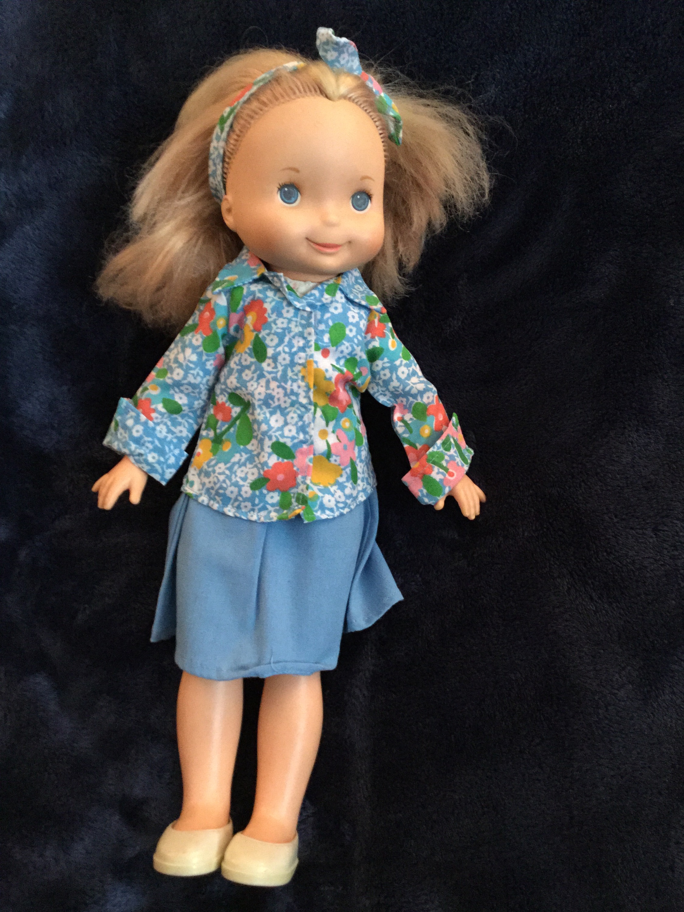 At a time when many families made their own clothes, Fisher-Price facilitated homemade additions to the My Friend dolls’ wardrobes. Most pre-made outfit packages included a pattern for an additional garment or accessory. Fisher-Price also collaborated with McCall’s to publish sewing patterns for My Friend size doll clothes. The pattern is McCall’s 9167, if you’re looking for a second hand one. A book of patterns, Four Seasons Fashions for My Friend Dolls, was also published.